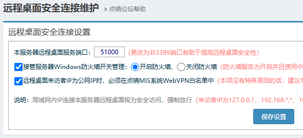 为了确保点晴MIS系统所在Windows Server服务器的安全,对于启用了远程桌面访问IP为公网IP时,必须在点晴MIS系统WebVPN白名单中”的单位,管理员用本地电脑上的远程桌面程序登录时,如果登录电脑的IP地址不在WebVPN白名单内,点晴MIS系统就会自动将此IP加入Windows Server防火墙黑名单,禁止连接。