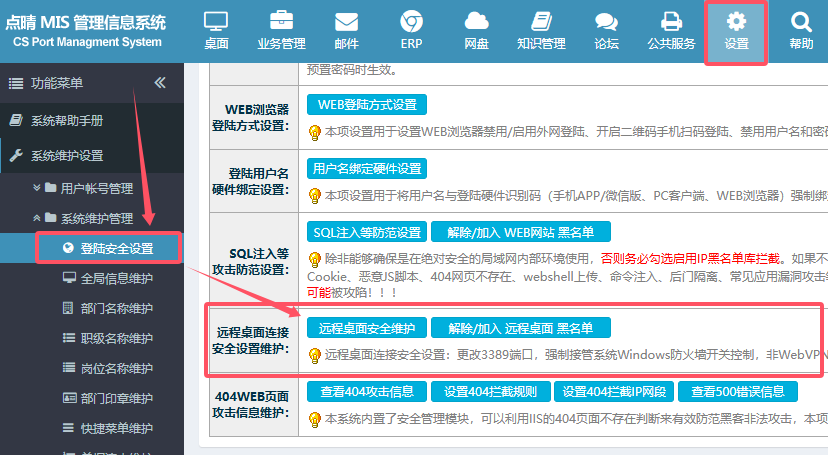 进入设置->系统安全设置-》系统维护管理,找到菜单“登录安全设置”,找到如下位置“远程桌面连接安全设置维护”,点击进入: