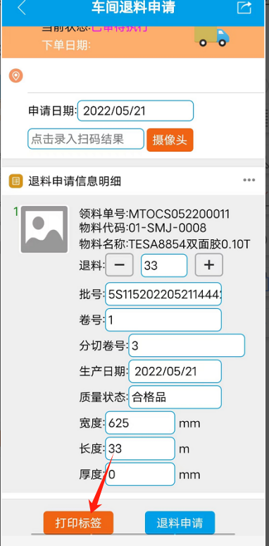 点晴模切ERP-生产退料蓝牙打印标签-操作流程