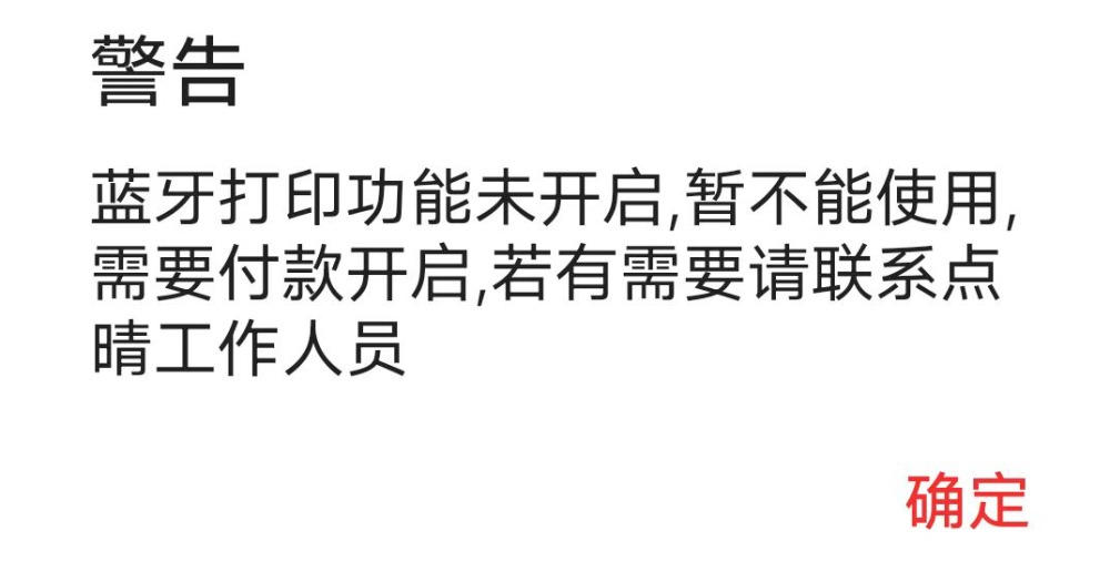 点晴模切ERP-弹出提示:蓝牙打印功能未开启,暂不能使用,需要付款开启,若有需要请联系点晴工作人员