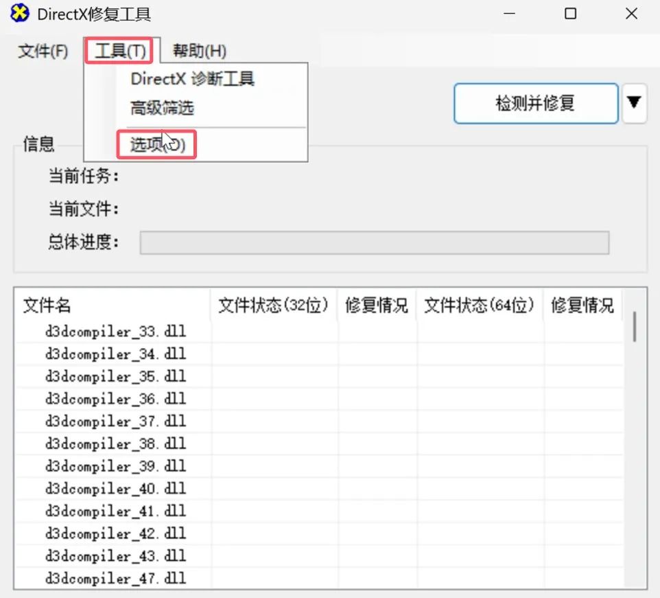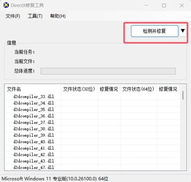 设置好后,回到主界面,点 “检测并修复” 按钮,软件就开始自动检测并修复 DirectX 运行库的问题。