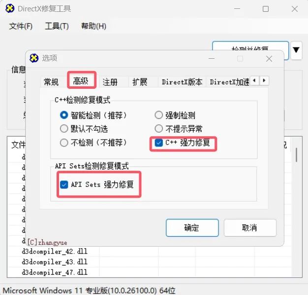 然后在弹出来的页面里点 “高级”,把 “C++ 强力修复” 和 “API Sets 强力修复” 这俩选项勾选上,这俩选项很关键,能让修复更深入、更全面。