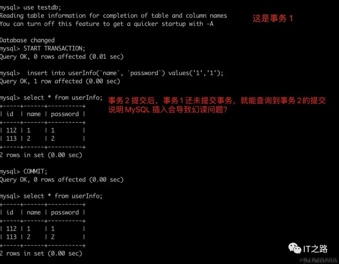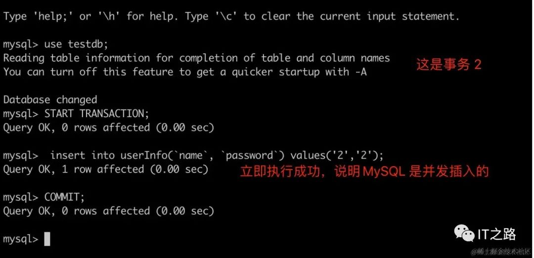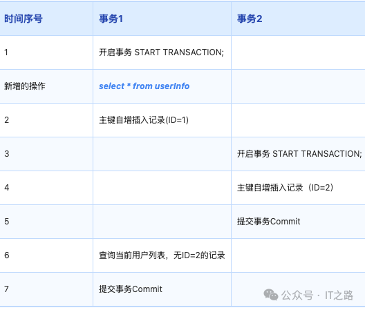 最近和同事争辩起来,MySQL插入是并发还是串行,我记得明明是串行插入,同事非要和我杠,说MySQL可以并发插入。 我要亲自试验一下,打他的脸! 定义表结构MySQL 实验版本 8.0,首先定义 用户信息表userInfo,其中id为自增,name具有唯一索引。 验证流程默认情况下,在命令行中 MySQL会自动提交,每个SQL执行会非常快,无法验证同时执行的两个事务之间是否存在阻塞情况,所以需要显示开启事务和提交事务 。 开始验证首先,我们开启两个事务。在事务1中,首先插入一条记录,暂时不提交。然后,在事务2中开启一个新的事务,并插入一条自增记录。 如果MySQL的innodb插入是串行的,那么此时事务2的插入记录将会被阻塞。如果没有被阻塞,那就说明MySQL的innodb插入是并发执行的。 实验验证事务2 的执行记录 如上图所示,在事务1还未提交,事务2在事务1的间隙中插入一条记录,插入操作立即成功,并且事务2的自增主键ID为2。这说明在MySQL中,当一个事务正在插入记录时,并不会阻塞其他事务的插入。 在MySQL中,多个事务之间的插入操作是并发进行的,而不是串行进行的。 我感觉自己的脸热热的,小丑竟是我自己,赶紧给同事认了错…… 我的认知一直是错误的。 但是在底层存储层面,MySQL会对数据页加锁。如果两条记录在同一个数据页,实际写入是串行的,但是事务层面是并发的。 想象一下,库存扣减和新增库存流水在同一个事务中,如果新增库存流水是串行的,那将极大的降低库存事务的并发度啊。 本以为验证结束,打卡下班,结果发现 MySQL插入似乎存在幻读问题! 从下图中可以观察到,事务1在插入时似乎确实出现了幻读问题! 事务 1 的执行记录显示,事务1先于事务2开启,但是事务1期间可以查询到事务2提交的记录。这说明有幻读问题! 为什么出现幻读?所谓幻读,是指在一个事务读取记录时,另一个事务在此时插入或删除了一条记录,导致第一个事务再次读取时发现记录的数量发生了变化。 要想理解出现幻读的原因,需要先了解MySQL是如何解决幻读问题的。 为了解决幻读问题,MySQL采用了间隙锁和多版本并发控制(MVCC)的方法。间隙锁会锁定一段记录的范围,其他事务无法对这些记录进行更新或删除操作。这样,当当前事务再次进行查询时,就不会出现记录数量的新增或减少的情况了。 MySQL 插入时加了什么锁?MySQL 插入时存在幻读问题,说明MySQL 并没有加间隙锁,主要考虑也是为了提高插入时并发度,如果添加间隙锁,势必导致插入并发度降低!MySQL 在插入之前会申请 插入意向锁,而记录本身不冲突(无唯一键冲突)插入意向锁就不会冲突。 MySQL 文档中记录了 插入意向锁
