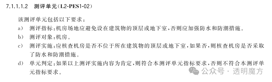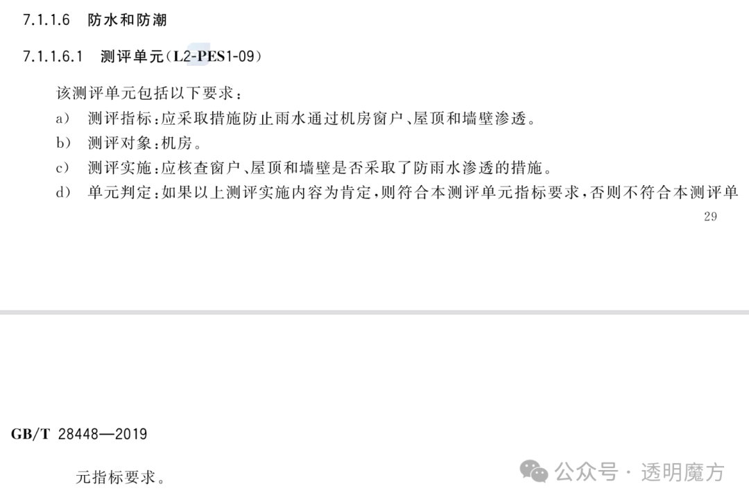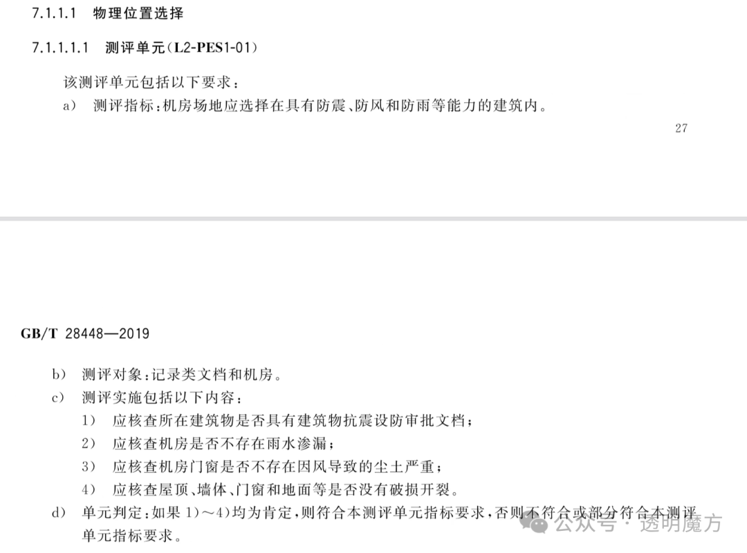 今天陪3位测评师到客户现场进行等保测评。这家客户是一个重点高中,机房在一幢新建的大楼里。负责测机房的测评师是组长,虽然经验丰富,比其他两位看着资历老,其实也还是一个年轻人。他首先问客户的就是,机房是在几楼,得知是在中间楼层后,他就预判机房可以防水防潮,以防止因水害导致的设备损坏。我查了一下,判断依据应该是GB/T 28448-2019的L2-PES1-02