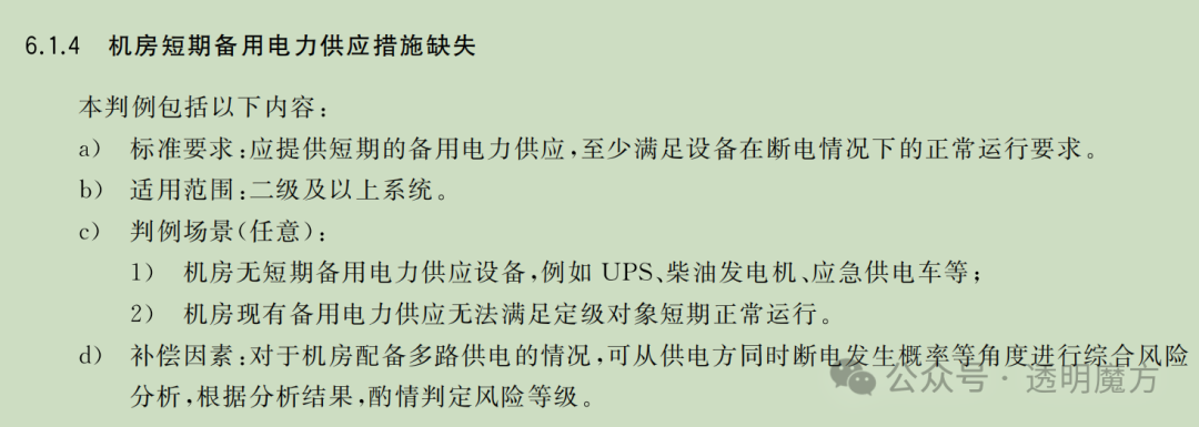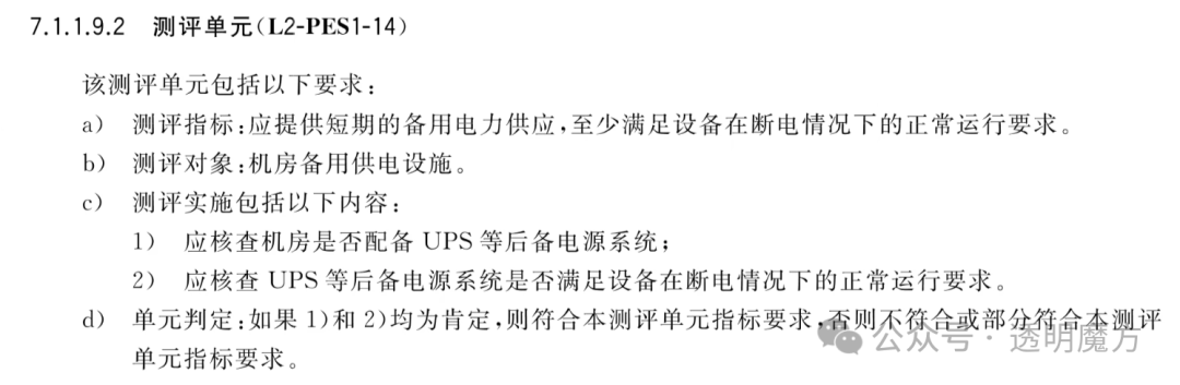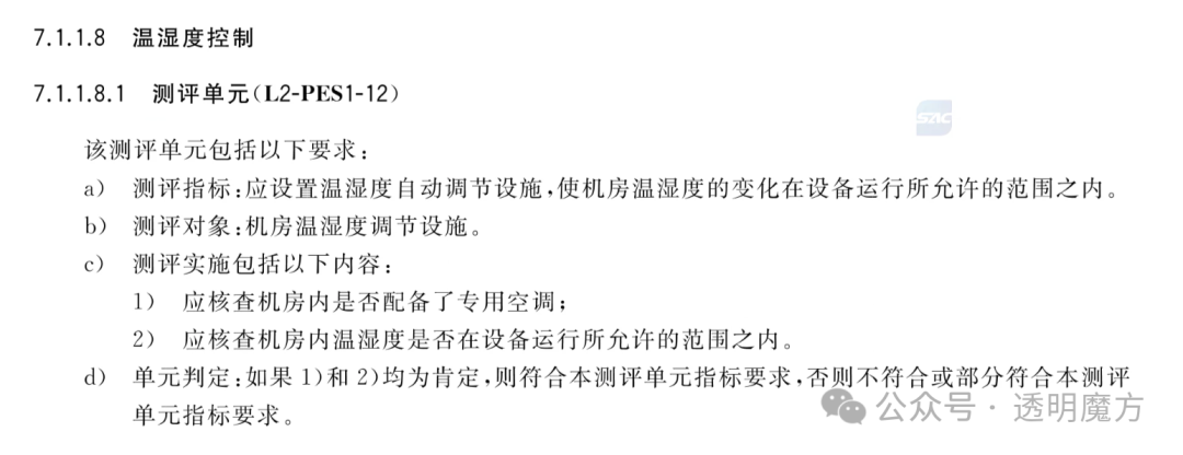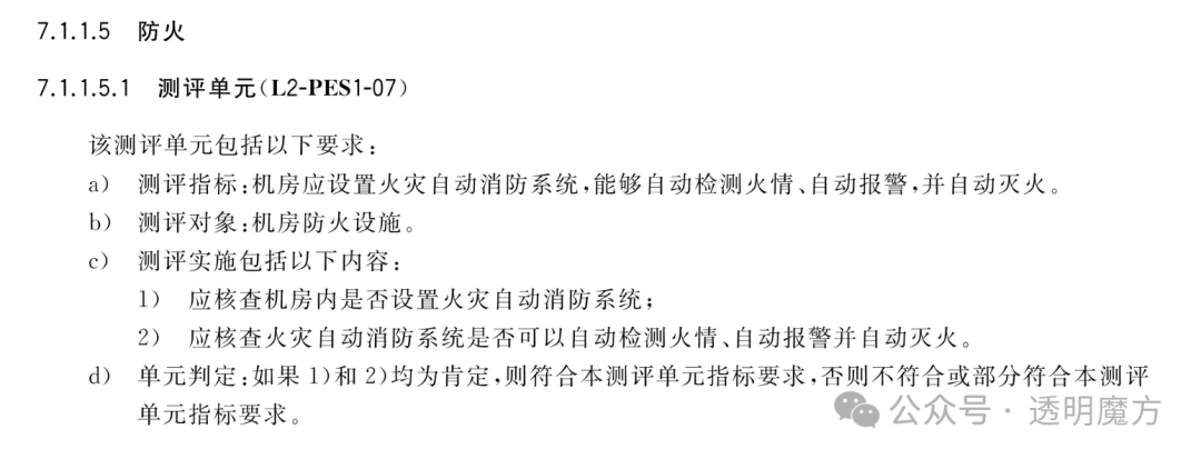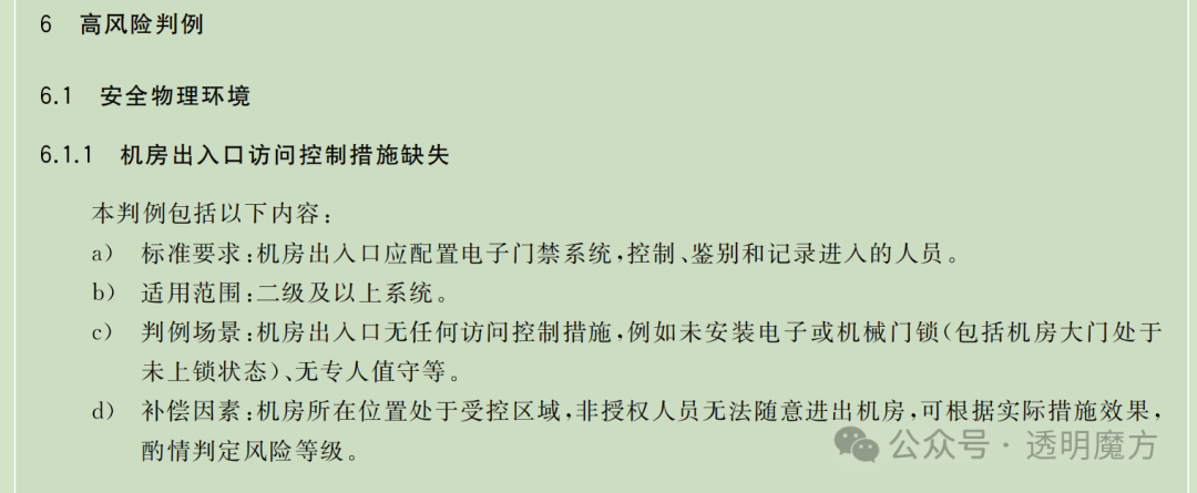 接着测评师一行到了机房门口,甲方老师刷门禁卡进来。测评师问:“你们刷的门禁卡是加密的吗?系统里面有谁进刷卡来的记录吗?” 甲方老师说:“是加密的,有记录。”测评师又扫到了门口的桌子上有纸质的进出登记表,里面有近期的人员登录记录。问:“那外部运维人员进来是用这个登记吗?我们也需要登记一下。” 甲方老师说:“是的,外部人员在这里填写。”我查了一下,判断依据应该是GB/T 28448-2019的L2-PES1-03。不过,这个测评要求并没有要求门禁卡采用加密技术,于是我问了一下测评师为啥要强调这点,他给我讲了一个原则——所有的测评都是建立在安全的原则,国标上面就一句话,但每个测评机构的测评点都会自己在安全的原则上做适配。如果这个门禁卡没有做加密,那么可以无穷复制,这样门禁卡一旦丢失就会被复制很多张卡,就不安全了。另外,一般的非加密门禁卡也不会记录人员信息。这是一个修得比较漂亮的机房,进去后听不到太多噪声,因为有落地的玻璃门做了隔断,把机柜和服务器等设备放在玻璃门内。测评师问:“这个玻璃门有3c认证吗?” 然后在玻璃门上框找到了3c认证标识。我有点好奇为啥要看这个,后来一查,3C认证的玻璃在强度、耐冲击性、热稳定性等方面都有更好的表现。这个应该是对应的L2-PES1-08这条,要采用耐火等级的材料,防火用的。测评师环顾了一下周围,发现墙面有一点裂缝,用漆补了一下,那个漆看着很像是漏水痕迹,于是走近细看了一下。然后他问:“你们有防震的验收报告吗?”甲方老师说:“这个没有。” 测评师说:“按道理应该要看防震验收材料的,不过也可以通过观察来判断,这里有一点裂缝,会产生相应的疑问。”我仔细看了一下,那个裂缝更像是漆面裂缝,不太像墙主体层面的裂缝。这条应该是下面这条L2-PES1-01:接下来,测评师进到机柜区域,去检查了防雷击—机柜接地。这个应该是L2-PES1-06,因为机柜是铁皮柜,刀片服务器用螺丝拧在柜子上,所以他只检查了机柜的接地线,没有再看设施设备的接地情况。测评师给我说,他见过有的客户用木头柜子装设备,那这种设施设备就要单独接地了。接下来,测评师看到服务器和交换机等设备上贴了黄色防水标签纸,告诉我这种标签纸不易脱落且防水,如果用老的那种白色标签纸容易脱胶且不防水。测评师踩了踩静电地板,问这个通信线缆是是铺设在地板下面吗?强电弱电是否分槽铺设,得到了肯定的答复。接下来,一行人又看了空调,这个机房有4台格力精密空调,这个空调很大,比家里的双开门冰箱还大,温度在20度左右,湿度在36左右。测评师给我指了指空调旁边的两个粗管子,告诉我这个是排水管。我网上查了一下,发现机房精密空调确实需要排水管,主要用于排放空调运行过程中产生的冷凝水。精密空调的排水管应接入建筑物的排水系统中,并确保排水畅通无阻。排水管应有一定坡度,排水管接头要求用喉箍固定,以防止水溢。此外,排水管需做保温和固定。这个应该是看的L2-PES1-12。接下来,又看了UPS,这个学校买了很多山特的电池,但据学校老师介绍,平时测试也就能用1小时左右。测评师说二级系统1小时也可以,不过这么多电池只能1小时不是很正常,建议联系厂家更换电池。我查了一下,这条应该是看的电力供应L2-PES1-14。接下来,看了一下七氟丙烷灭火器,发现虽然压力指针还在绿色的范围,但是超过5年了,一般来说在5年内认为是在保质期内,还是有点小问题。测评师建议换气。然后,我自己又翻了翻高风险判定指引,发现二级物理环境主要看下面几条: