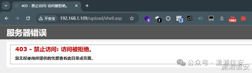 配置文件禁止了脚本执行,我们可以随便输入一个ASP脚本文件名进行简单测试,无论这个文件是否真实存在都会提示403