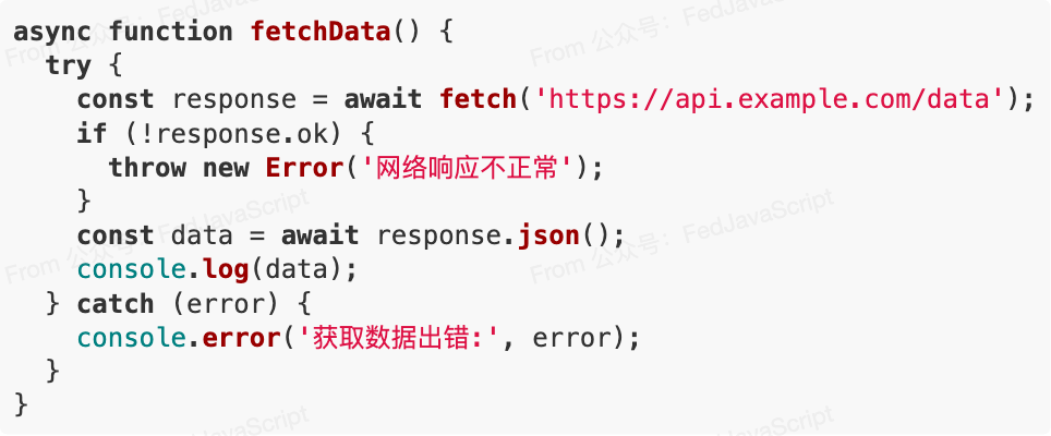 fetch API 基于 Promise,这意味着我们可以使用 .then() 和 .catch() 方法来处理异步操作,代码结构更加清晰。更进一步,我们还可以结合 async/await 语法,使异步代码看起来更像同步代码: