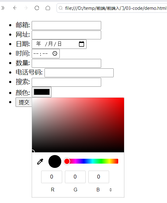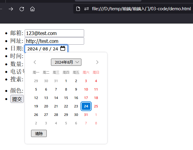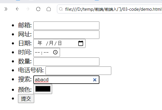 以下 input 类型是 HTML5 中的新类型:color、date、datetime、datetime-local、month、week、time、email、number、range、search、tel 和 url。