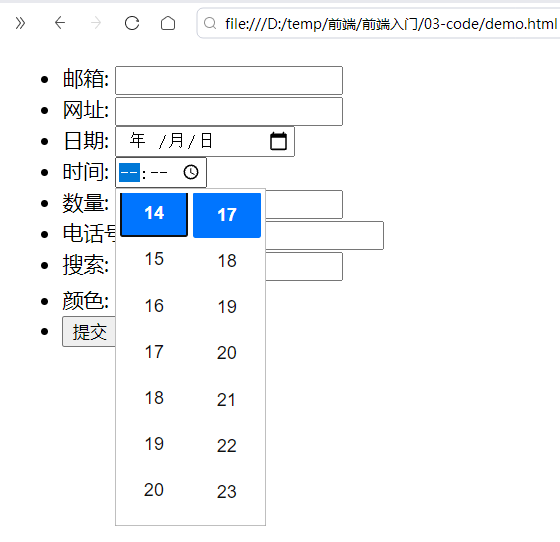 datetime-localNew | 定义 date 和 time 控件(包括年、月、日、时、分、秒、几分之一秒,不带时区)。 |