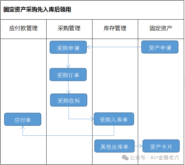 适用于外购固定资产先入库后领用的场景,物料属性需为“外购”且勾选“允许资产”。操作步骤包括标准采购流程中的【采购订单】、【收料通知单】和【采购入库单】,随后通过【其他出库单】完成资产领用,并生成资产卡片及相关凭证。