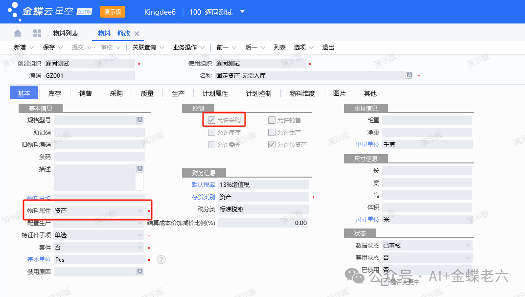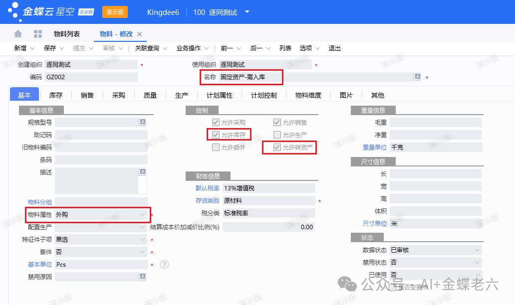 物料属性:需为"外购"且勾选"允许资产",如下图所示