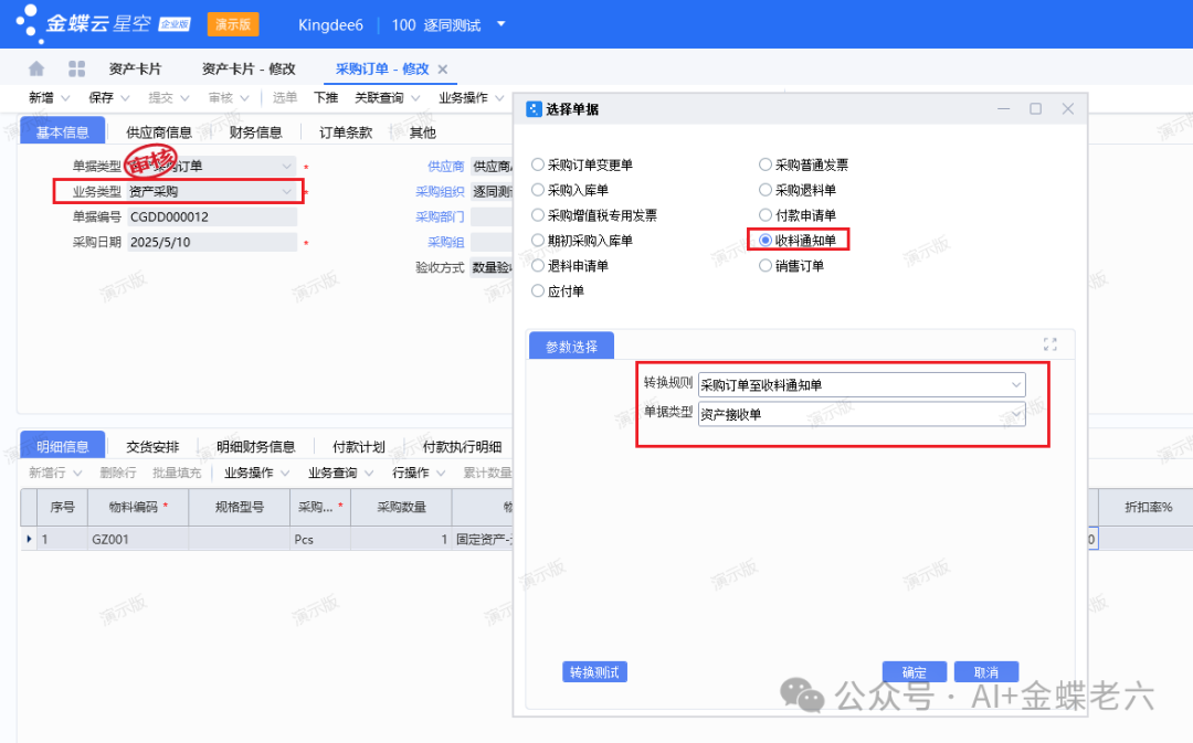 - 固定资产模块新增【资产申请单】→审核→下推【资产采购申请单】→审核→下推【采购订单】→审核→下推【收料通知单】→审核→下推【标准应付单】
