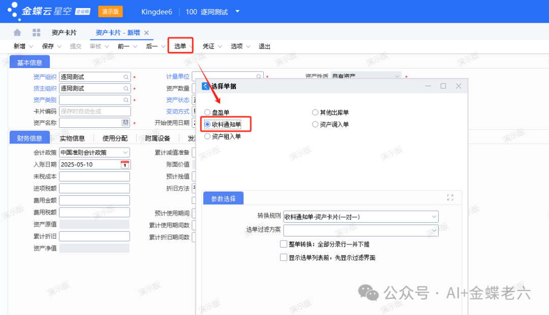 - 在【资产卡片】中新增卡片,选择资产类别→点击工具栏【选单】→选择【收料通知单】→关联生成的收料通知单→填写其他信息→保存提交审核