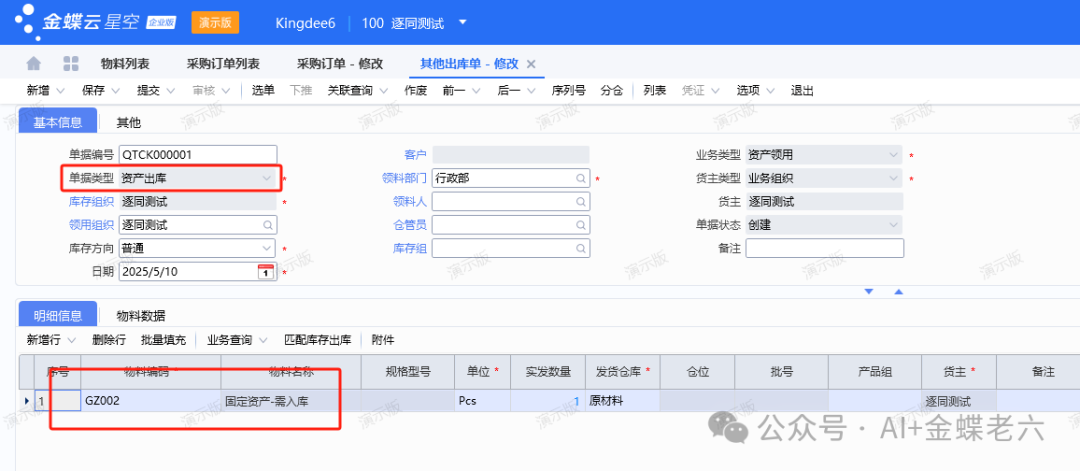 在【库存管理】中新增【其他出库单】→单据类型选择"资产出库"→填写必填项→保存提交审核,如下图所示。