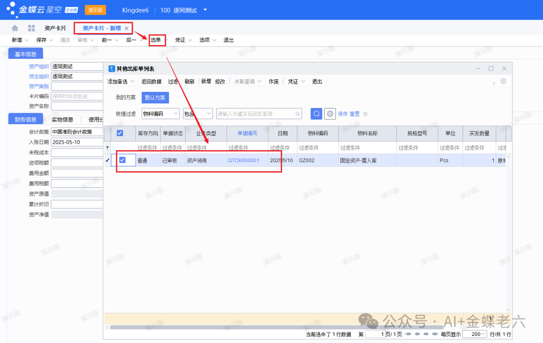 在【资产卡片】中新增卡片→选择资产类别→点击【选单】→选择【其他出库单】→关联其他出库单→填写信息→保存审核,如下图单所示。