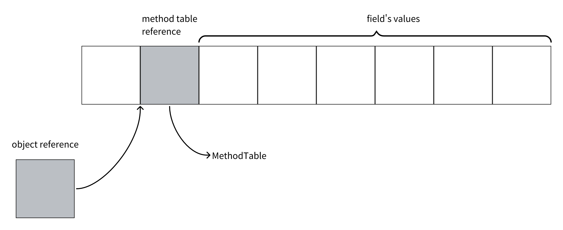 对象引用,也就是我们常说的引用类型变量,是一个类型安全的指针,指向引用类型实例的 MethodTable 指针,通过偏移和计算可以访问对象头和字段。