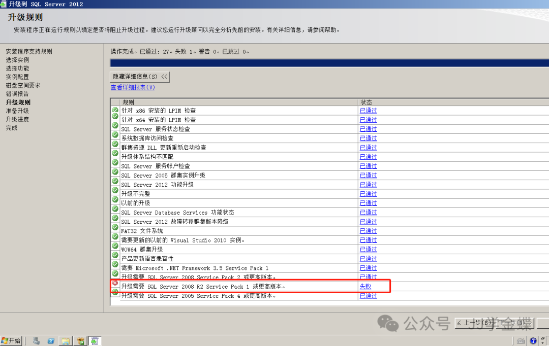 金蝶KIS云·旗舰版自2023年Q4补丁PT173775起,明确要求数据库为Sql Server 2012及以上版本。那么,原本安装Sql Server 2008 R2的客户该如何升级数据库,以体验综合补丁的便利性及部分新增功能呢? 通常的升级方法是先备份账套,接着彻底卸载Sql Server 2008 R2,之后安装Sql Server 2012,最后恢复账套。然而,这种方法容易因卸载不彻底而引发其他问题,影响金蝶KIS云·旗舰版的正常使用。 经过一番摸索,成功实现了将Sql Server 2008 R2升级到Sql Server 2012的安装。并且,安装完Sql Server 2012后,账套会自动迁移至Sql Server 2012中。 官方文档明确指出,SQL Server 2012支持从以下版本的SQL Server进行升级: ·- SQL Server 2005 SP4或更高版本 ·- SQL Server 2008 SP2或更高版本 ·- SQL Server 2008 R2 SP1或更高版本 帮助文档链接如下: https://learn.microsoft.com/en-us/previous-versions/sql/sql-server-2012/bb677622(v=sql.110)?redirectedfrom=MSDN https://learn.microsoft.com/en-us/previous-versions/sql/sql-server-2012/ms144267(v=sql.110) 具体步骤如下: 1、下载安装SQL Server 2008 R2 sp1以后的补丁 我升级用的SQL Server 2008 R2 sp2,下载链接如下: https://www.microsoft.com/zh-CN/download/details.aspx?id=30437 ![]() 根据自己机器的处理器架构进行选择即可,我进行更新的机器为Windows Server 2008 R2,因此选择的架构为x64版本。 该补丁包的具体安装方式与SQL Server2008 R2的安装方式相同,一路点击"下一步"即可完成安装。升级过程很快,几分钟即可完成。升级完成以后重启电脑。 ![]() 打补丁之前升级报错如下图: