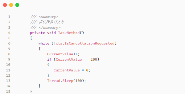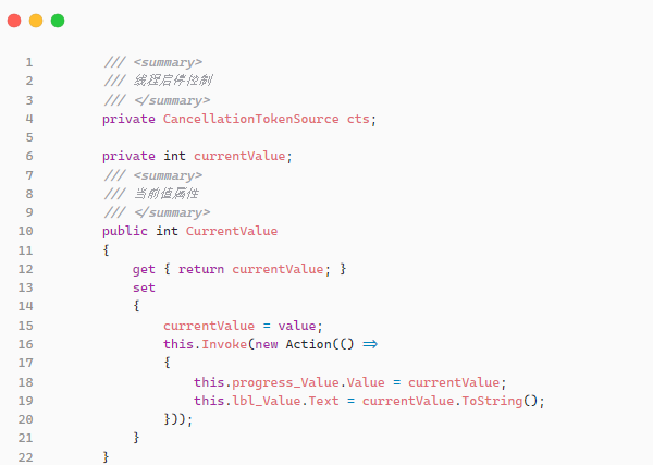 我们可以看到在方法里调用了一个cts对象,这个对象就是CancellationTokenSource的对象,因此我们需要创建一个CancellationTokenSource对象cts,同时在属性CurrentValue中,要显示控件的值,这里需要用到委托实现跨线程访问的问题,这个我们后续专题讲解,代码如下: