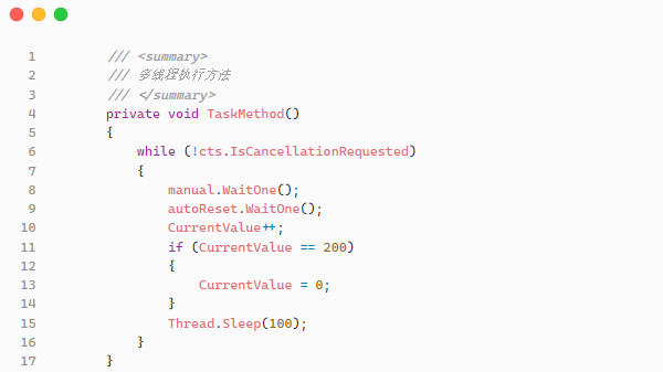 暂停继续的使用除了ManualResetEvent,还有一个AutoResetEvent,AutoResetEvent和ManualResetEvent的用法基本上是一样的,这里就不过多赘述,大家可以自己尝试一下。