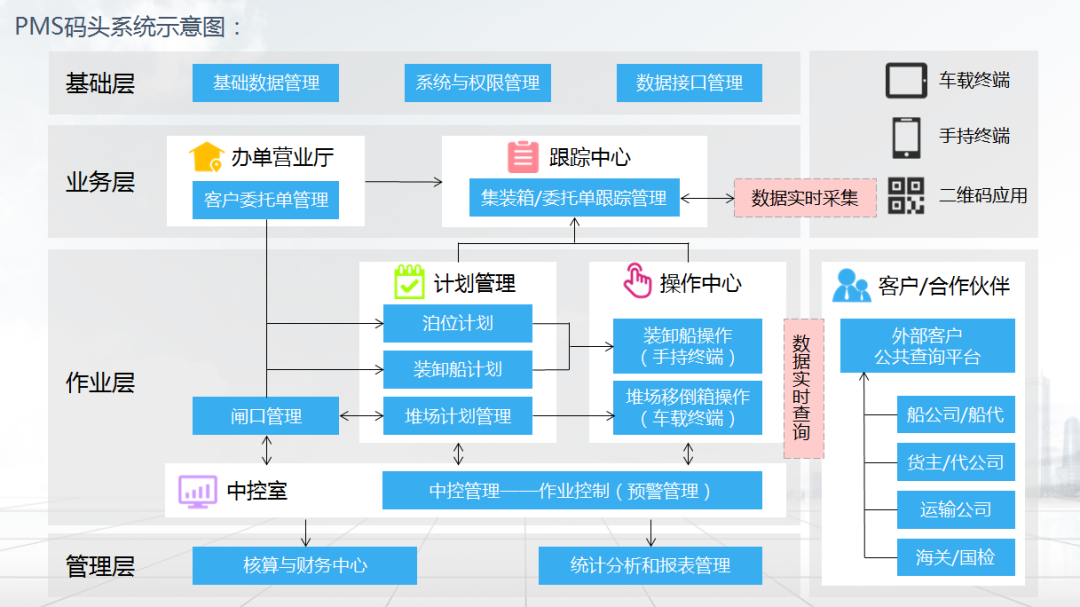 点晴PMS码头系统主要针对码头集装箱业务与散货业务日常运作管理、调度管理、堆场管理、车队管理、财务费用管理、相关报表等业务、结合码头作业特点,围绕调度、堆场作业而开发,集技术的先进性、管理的有效性于一体,是物流码头管理及其它港口类企业管理集成的高效管理信息系统。在数字化转型浪潮下,码头作业的全流程可视化已成为提升竞争力的核心手段。点晴PMS通过数据整合、智能分析、动态可视,帮助港口企业实现降本增效,迎接智慧物流新时代。