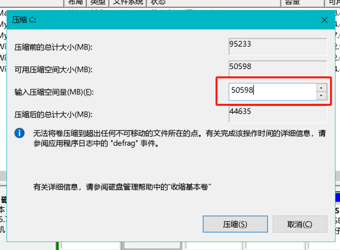 2.如果你的新电脑只有C盘,那么在右侧也会看到C盘的主分区,选中C盘分区右键点击“压缩卷”,然后输入压缩空间量,1GB=1024MB,如果是500GB的C盘,那么可以分出200~300GB的空间,换算成MB输入进去即可,再点击“压缩”;