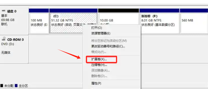 如果C盘做过清理优化后依然爆红,那么就要考虑拓容C盘空间了。操作之前,在磁盘管理右侧查看是否有未分配空间,如果没有,就要从相邻的分区D盘里分出未分配空间,再未分配空间通过“扩展卷”合并到C盘空间。但是要注意,在要进行压缩的D盘分区上有一些文件可能正被其他程序占用,为了确保操作成功,建议先关闭所有不用的软件。操作如下: