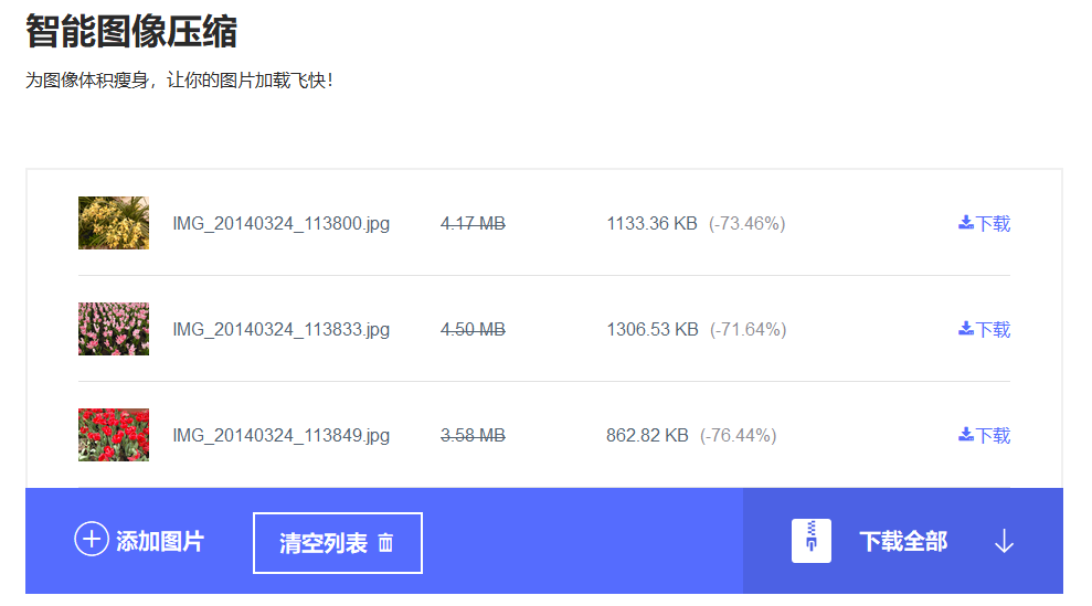 当选择的图片上传完成以后,云服务就会对这些图片进行压缩操作。该云服务通过已有训练的压缩模型,来选择性地减少图像中的颜色数。在减少图片体积达到极限的同时,让肉眼几乎看不出与原图的差异。当图片文件压缩完成以后,我们就可以在列表里面看到压缩后的文件体积以及压缩的百分比等信息,可以看到通常的压缩比都在70%左右。点击后面的“下载”按钮,就可以将指定的图片下载到硬盘里面。当然我们也可以点击“下载全部”按钮,从而将这些文件进行打包后再进行下载。