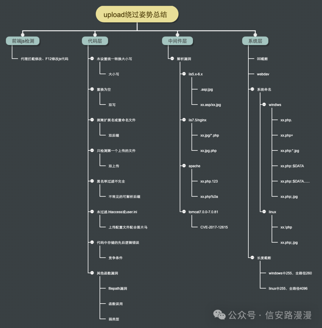 本篇文章总结了常见的文件上传方式,以及在一些过滤情况下的绕过方式,最后还说了如何通过正确的方式去防止文件上传漏洞。