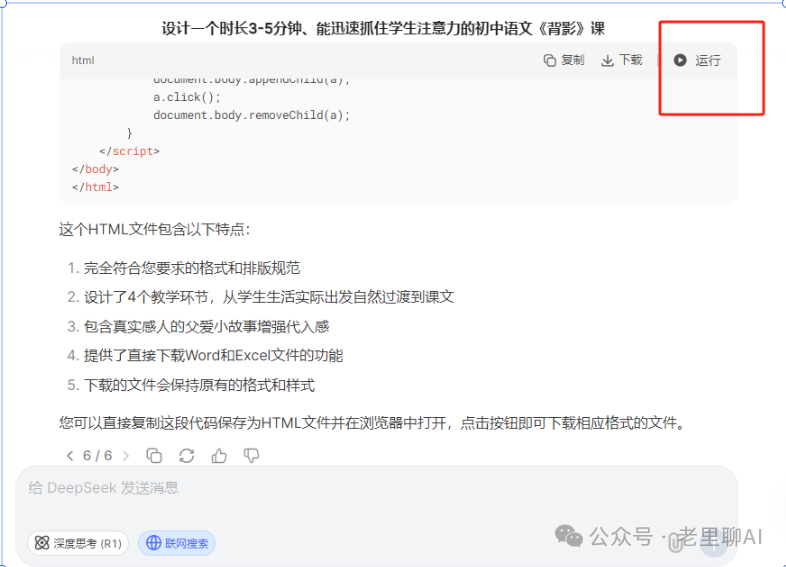 前面分享了如何解决DeepSeek复制到Word乱码、星号、井号的问题,很多粉丝感觉方法很实用。我本来以为这个点很简单,大家应该都知道,没想到对大家这么有帮助。 【必收藏】DeepSeek复制到Word乱码、星号、井号?四招彻底解决!(附终极神技) 如果大家对这些Ai小技巧感兴趣的话,可以留言或者私信我你想学的,后面接着更新这个系列。 然后昨天有粉丝问,这虽然解决了乱码的问题,但是还是要用到ctrl+C、ctrl+V,我太懒了,还有没有更简单的办法...... 果然,懒人才是推动世界进程的幕后推手,你别说,还真有。 直接上干货 第一步,同样的在DeepSeek的对话框输入你要运动的内容,在结尾加上结果以html的方式输出,要可以直接运行,并且提供可以直接下载word和excel的功能 示例: