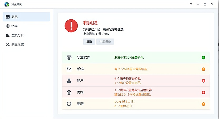 安全顾问是群晖DSM系统中内置的应用程序,可以对您的群晖NAS进行场景选择后的扫描,扫描后的风险选项可提供如何解决建议。
