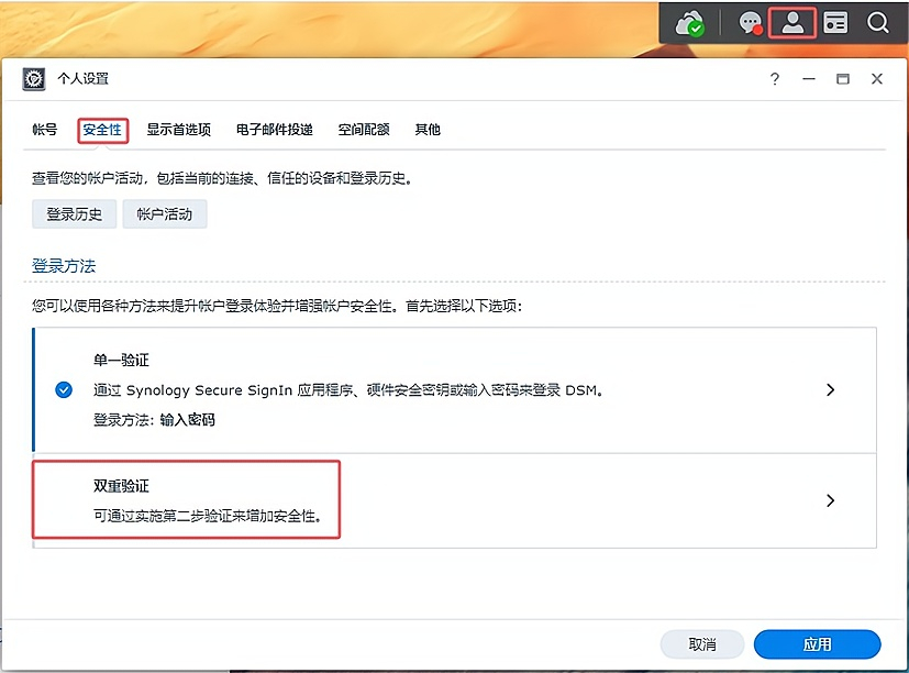 启用个人双重验证,您需要前往DSM系统右上角找到个人设置选项 > 安全性> 双重验证。