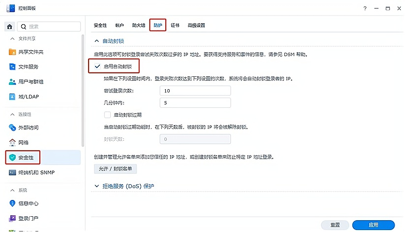 对于 DSM 7.0 及以上版本,在以下位置配置自动封锁:前往控制面板 > 安全性 > 保护。