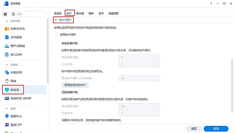 ▼您可以启用帐户保护,以降低帐户被暴力攻击的风险。此功能支持以下服务和套件:DSM、File Station、Audio Station、Video Station、Download Station、Mail Station、Cloud Station 和 Synology 移动应用程序。