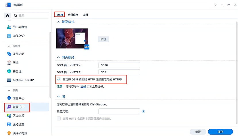 您可以使用以下方法启用 HTTPS DSM 登录使用HTTPS协议,控制面板 > 登录门户 > DSM 以选择自动将 HTTP 连接重定向到 HTTPS 。