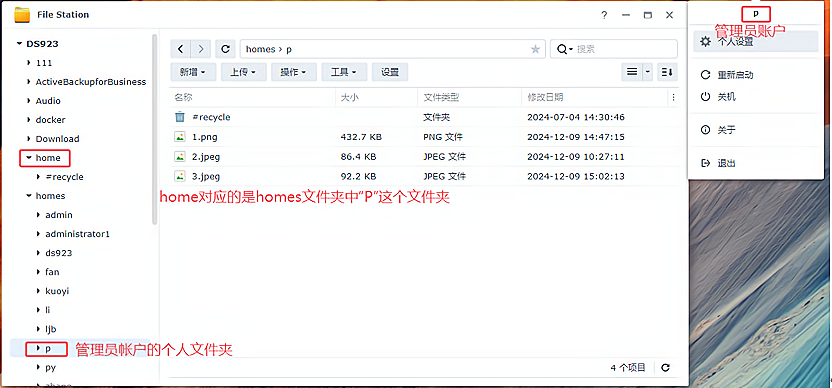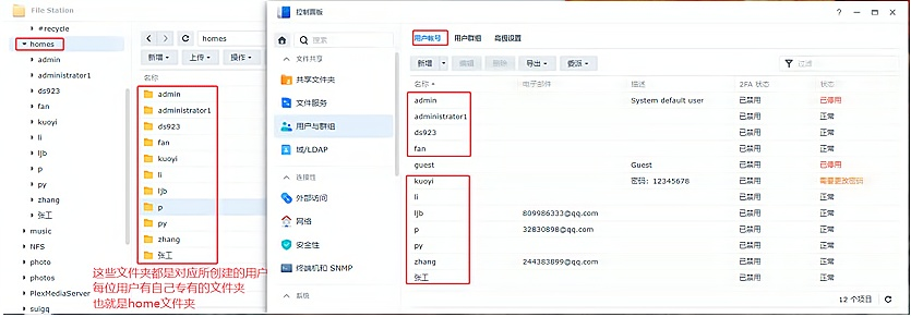 摘要:我们在使用群晖NAS的时候,在系统中启用了“家目录”后,系统会自动生成“homes”文件夹,管理员打开File Station后却能看到“home”和“homes”这两个文件夹,说到这里想必大家都会有疑问为什么会有两个文件夹呢?这两个文件夹到底是什么关系呢,接下来就给大家详细的介绍下。 ▼homes文件夹是群晖自带的文件夹,就类似我们安装特定软件后生成的特定文件夹一样,如video、photos等等。我们可以在控制面板---用户与群组---高级设置中启用“家目录”后,启用后系统就会自动生成“home”和“homes”这两个文件夹。 ▼我们在使用的时候会发现,普通用户登录系统后只能看到了“home”这个文件夹,但是管理员帐户登录后可以看到“home”和“homes”两个文件夹,并且home里边的数据在homes中也有保存,这样说来岂不是保存了两组一模一样的数据,并且占用了双倍的存储空间容量吗?大家大可放心,NAS中所保存的只有一组数据,也就是系统homes中保存的数据也是真正的数据。home文件夹是个人文件夹,只针对个人帐户开放,每个帐户对应的home文件夹只能自己访问,其他用户无法进行访问(管理员除外)。 ▼大家可以把home文件夹当作是homes共享文件夹中个人文件夹的镜像。下图展示的是我用管理员帐号“p”登录后,在File Station中能看到homes文件夹和home文件夹,这里的home文件夹就是用户“p”的个人文件夹,所对应homes共享文件夹中的子文件夹“p”。往home中拷贝数据就是在往子文件夹“P”中拷贝数据。 ▼homes文件夹中包含所有个人文件夹,在homes共享文件夹中所显示的子文件夹都是以用户名命名的,这些以用户名命名的子文件夹就是我们在File Station中看到的home文件夹。 我这里以自己的理解打个小比喻,我们都知道银行金库内有好多的小金库,这些小金库保存的都是一些大人物所保存在里边的重要文件和物品。这些小金库只有这些大人物自己才能进行打开拿取物品,(特殊情况下银行的工作人员才可以去打开个人的小金库),这个保存个人物品的小金库就可以看做为“home“文件夹。那么银行这个大金库可以是作为”homes”文件夹。这个比喻也许不太严谨,但是道理是这样的,如果有更好的解释欢迎留言交流。 启用家目录的作用在于,当一台NAS有多人使用时,启用【家目录】功能,可以为每一位NAS用户(guest用户除外)自动创建个人「home」文件夹(也就是个人文件夹)。如果是一家几十人,甚至几百人的公司,开启【家目录】,就能在创建NAS账户时就自动建立一个账户文件夹了,而不用管理员手动一个个去创建个人文件夹了,大大减轻了工作量。如果是一个人使用那就没必要启用了。 还有两点需要注意,就是在安装特定软件的时候会提示让启用家目录,例如安装Synology Drive Server的时候会提示让启用家目录,这款网盘软件是需要区分开个人文件夹和团队文件夹的。 在一点就是我们在创建用户账号的时候不用去分配homes文件夹的权限,系统已经默认为用户分配好权限,如果您设置了homes文件夹的权限可能会出现个人文件夹无法访问或者能看到其他人员的个人文件夹数据。 注意:在删除用户帐号的时候会一起把此用户的家目录文件夹一起删除,如果有重要数据在此帐号的home文件夹中,需备份后在进行用户帐号的删除。 以上内容希望能帮助大家了解“home”和“homes”这两个文件夹。 该文章在 2025/5/16 12:49:11 编辑过 |