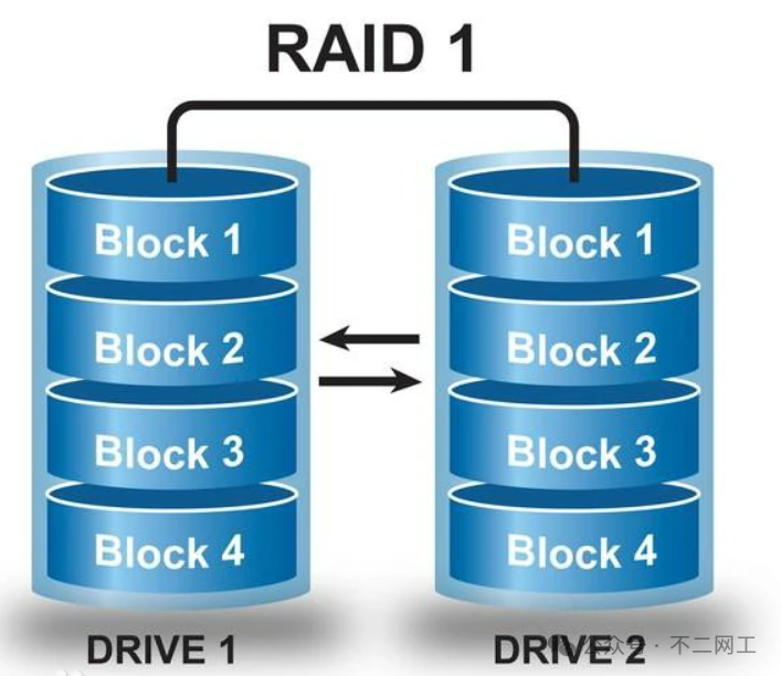Raid 1:只能用两块硬盘,两块硬盘的数据互为镜像(写慢,读快),一块磁盘冗余。