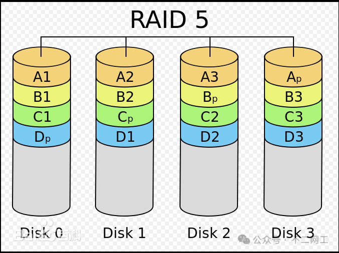 Raid 5:至少需要3块硬盘,一块磁盘冗余。它是最通行的配置方式。具有奇偶校验的数据恢复功能的数据存贮方式。奇偶校验数据块分布于阵列里的各个硬盘中。