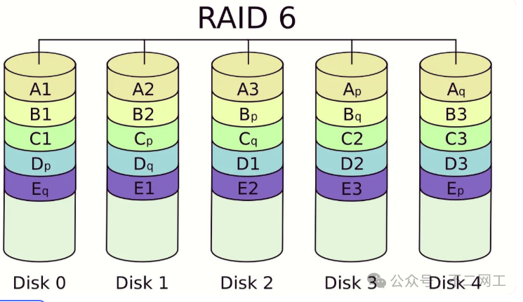 RAID 6:双重分布式校验,可容忍两盘故障,利用率 (N-2)/N(如 4 盘利用率 50%)。适合大规模存储和关键业务。