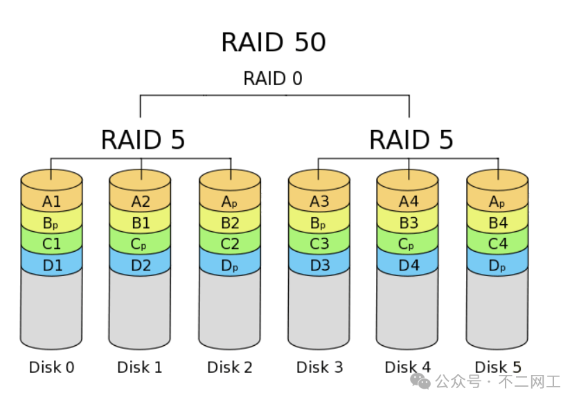 Raid 50:至少需要6块硬盘,磁盘的冗余相当于每三个硬盘做了一个Raid5,然后,每个Raid5又组合成了Raid0(Raid5中有一个硬盘冗余,即使坏了也不会破坏Raid0),所以,Raid50磁盘的冗余硬盘数量=磁盘总数÷3。