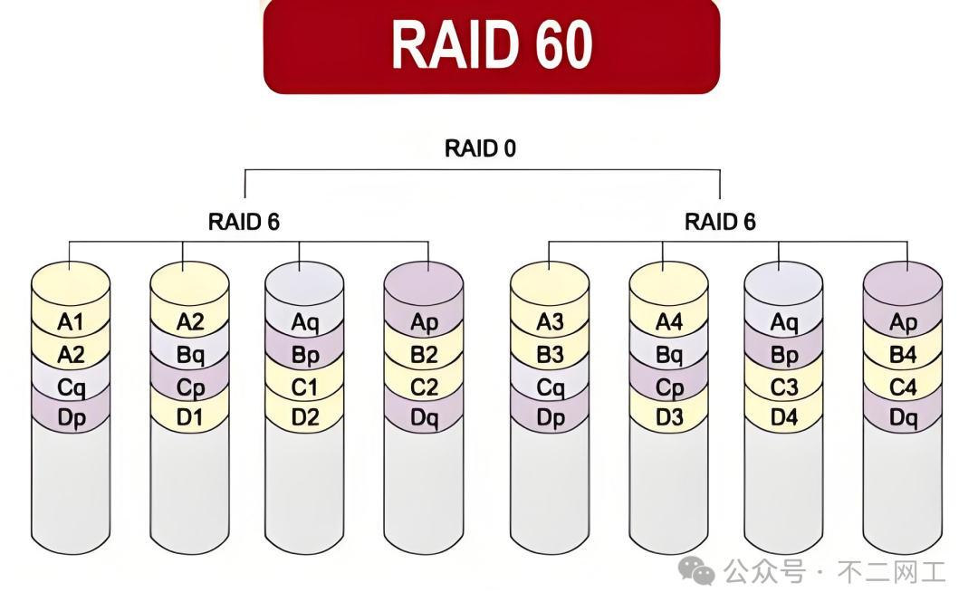 复合级别RAID 10:先镜像后条带,结合 RAID 1 的冗余与 RAID 0 的性能,可容忍多盘故障,但成本较高。适用于金融交易、高负载数据库等关键场景。RAID 50 :由两个或多个RAID 5阵列组成,形成类似RAID 0的条带化阵列。与配置相同数量的RAID 5相比,它提供了更高的访问性能和更强的数据保护性能。单个 RAID5 等效阵列称为“子集”或“子阵列”,可以配置三个或更多子集。RAID 60:(也称为 RAID 6+0)将多个 RAID 6 集(带双奇偶校验的条带化)与 RAID 0(条带化)结合在一起。双奇偶校验允许每个 RAID 6 阵列中的两个驱动器发生故障,而条带化可提高容量和性能,而无需向每个 RAID 6 阵列添加驱动器。