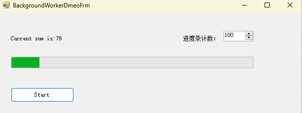 在C#中,经常会有一些耗时较长的CPU密集型运算,因为如果直接在UI线程执行这样的运算就会出现UI不响应的问题。解决这类问题的主要途径是使用多线程,启动一个后台线程,把运算操作放在这个后台线程中完成。但是原生接口的线程操作有一些难度,如果要更进一步的去完成线程间的通讯就会难上加难。 因此,.NET类库中提供了一个叫做BackgroundWorker的类可以比较优雅的解决这类问题。虽然BackgroundWorker类使用起来比较简单,但其中还是有一些需要注意的细节,下面我们就通过一个简单的Dmeo程序,来详细介绍它的主要用法。我们在Demo中计算1到100的累加和,为了演示效果,每次计算都睡眠600毫秒,Demo的界面如下: 用法概述: 在窗体上构建一个BackgroundWorker实例,在它的DoWork事件处理函数中添加耗时的运算,然后调用它的RunWorkerAsync方法就可以了。 1 private BackgroundWorker _demoBGWorker=new BackgroundWorker(); 2 3 public Form1() 4 { 5 InitializeComponent(); 6 7 } 8 9 private void BGWorker_DoWork(object sender, DoWorkEventArgs e) 10 { 11 //在这里执行耗时运算。 12 int sum = 0; 13 for(int i = 0; i < 100; i++) 14 { 15 sum += i; 16 } 17 } 18 19 20 private void btnStart_Click(object sender, EventArgs e) 21 { 22 _demoBGWorker.DoWork += BGWorker_DoWork; 23 _demoBGWorker.RunWorkerAsync(); 24 } 以上部分,暂时没有加入进度条的显示逻辑,以及其余耗时的计算,但我们可以先考虑下面几个问题: