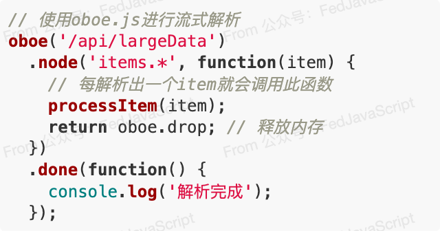 对于大型JSON数据,可以考虑使用流式解析库,如oboe.js