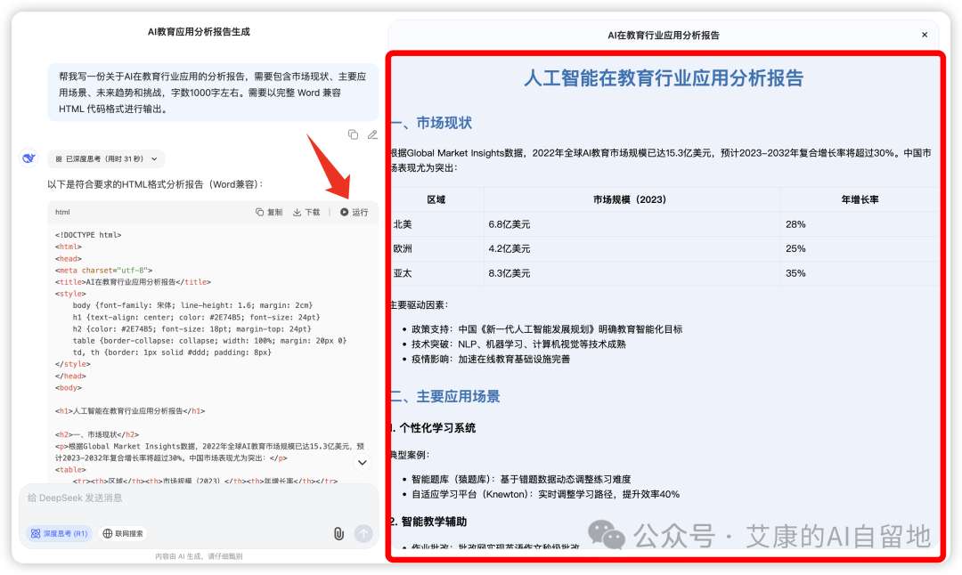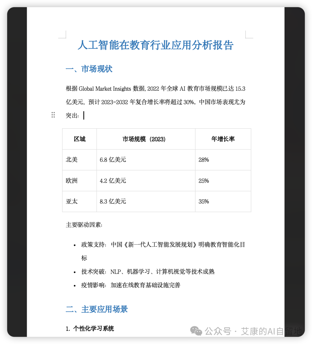 比如说,我最近在研究一个“AI在教育行业的应用”的课题,需要一份简单的分析报告。