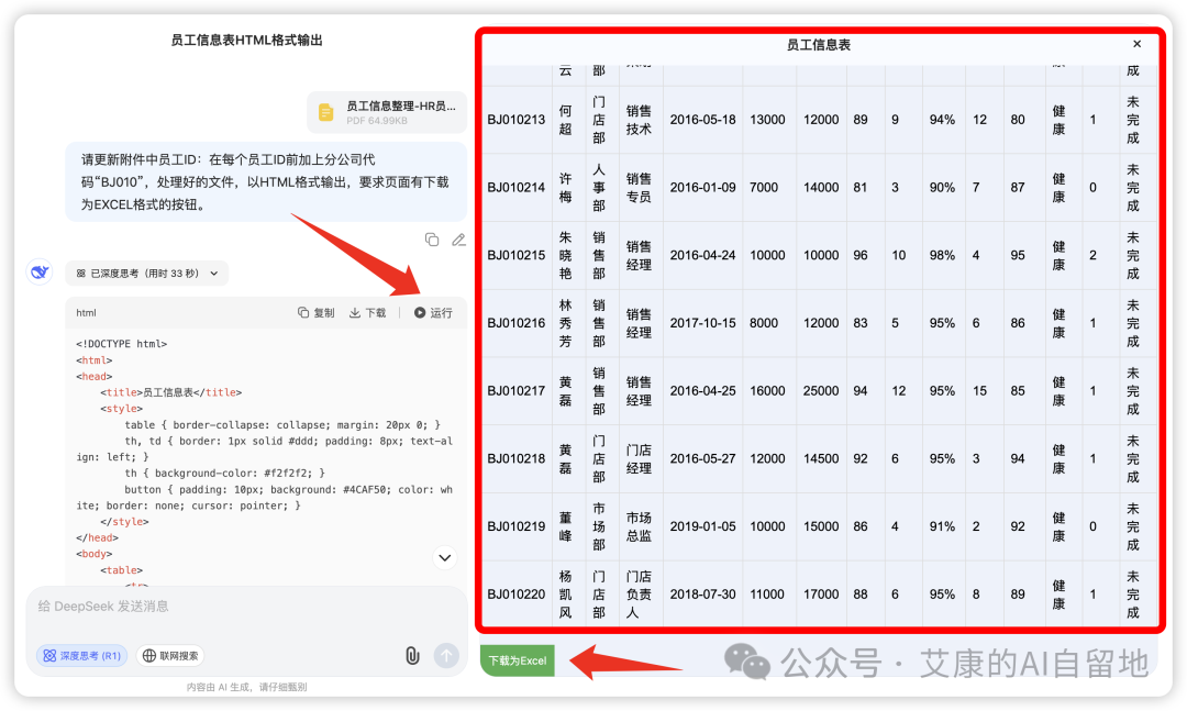 请更新附件中员工ID:在每个员工ID前加上分公司代码“BJ010”,处理好的文件,以HTML格式输出,要求页面有下载为EXCEL格式的按钮。