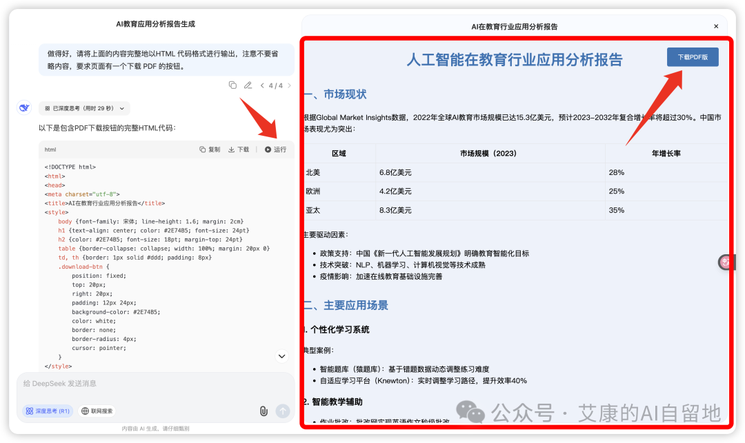DeepSeek 生成的学习资料、研究报告、方案展示等,都可以方便地导出为 PDF,确保内容的原始呈现。