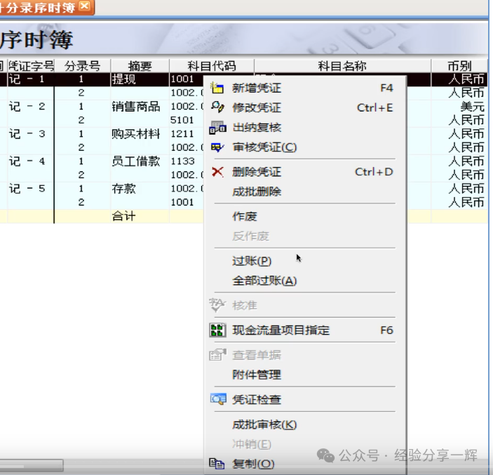 凭证字分类 可设置‘收’、‘付’、转’、‘记’、在(系统设置--基础资料--凭证字)里面设置。 ‘收’字凭证:作为现金或存款收入记账。 ‘付’字凭证:作为现金或存款支出记账。 ‘转’字凭证:作为没有现金或存款的转账记账。 ‘记’字凭证:通用型记账,不区分收付款,无限制。 一般中小企业:统一使用‘记’字凭证,简化操作。 大型企业:细分‘收’‘付’‘转’字凭证,强化内控。 凭证录入 外币凭证录入 如果有外币,点一下上面的(外币)图标,会出现外币换算。选择币别:如美元。例如:100美元,汇率是7,换算人民币就是700元。 单位数量凭证 例如:单价是10元,数量是50。 注意:如果所选(科目)有(项目辅助核算),选择科目后,需要在弹出的窗口中选择(具体项),例如:(其他应收款)启用了(项目辅助核算),核算项目是(职员),我们还要选择一下(职员名字)。 凭证查询 过滤条件:例如查2024年9月的全部凭证(会计年度选2024,期间选9,下面的审核选全部,过账也选全部)。 显示的排序:按自己须要,例如(按凭证号)。 方式:还有币别的过滤。 凭证处理 在凭证查询里面,可以对凭证进行各种操作。例如(新增,修改,审核,删除,作废,过账)等操作。注意:没审核没过账的凭证才可以修改,已过账凭证需先【反过账】→【反审核】→修改→重新审核过账。 凭证过账 凭证过账:将已审核的凭证数据更新到总账科目余额中,生成财务报表基础数据。 过账前:确认凭证为“已审核”状态,确保过账期间与凭证日期一致。 过账后:查询凭证状态是否显示“已过账”状态。检查科目余额是否更新。路径:【财务会计】→【总账】→【科目余额表】。 后面的几个功能,简单地讲一下: 凭证汇总:将已过账的凭证,按科目、期间、部门等维度汇总借贷发生额。 模式凭证:将常用凭证保存为模板,一键调用。 双敲审核:一张凭证需由两名不同岗位人员分别审核(如初审+终审),两次审核均通过后凭证才能生效。(如:大额资金超过10万元或异常账务处理使用) 标准凭证引入/引出:导出或导入凭证,支持格式。 总结一下:凭证的操作 1.凭证流程:入凭证-- 保存 --审核 --过账-- 查询/打印; 2.修改过账凭证:反过账--反审核--修改--重新审核过账; 3.凭证有手动录入和系统根据业务单据自动生成。 阅读原文:原文链接 点晴模切ERP更多信息:http://moqie.clicksun.cn,联系电话:4001861886 该文章在 2025/5/28 10:20:59 编辑过 |