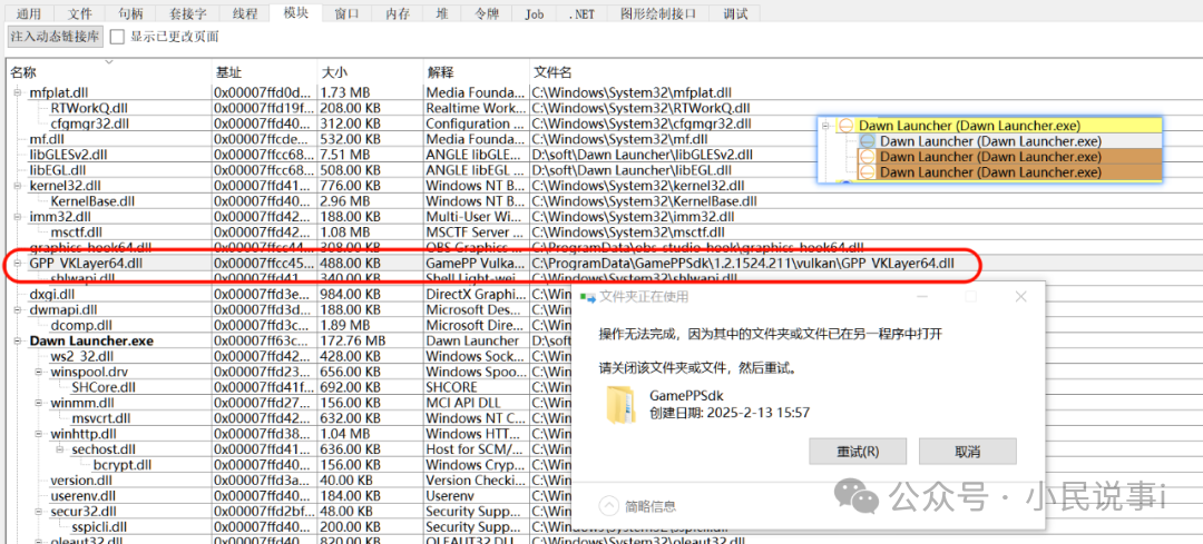 注意事项:发现可疑隐藏进程后,不要立即结束它,先在网上搜索该进程名称确认是否为系统组件,避免误杀导致系统不稳定。 3. 模块依赖分析这是Task Explorer最强大的功能之一。每个软件都依赖于大量DLL文件,普通用户看不懂这些关系,导致删除文件时经常遇到"文件被占用"的情况。 实际案例:想删除某游戏平台的残留文件,但系统提示"文件被占用"。火绒等工具却显示没有程序占用该文件。用Task Explorer的模块功能查看,发现Dawn Launcher关联了游戏加加的文件,关闭Dawn Launcher后才能顺利删除。 如何查看模块依赖: