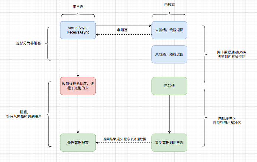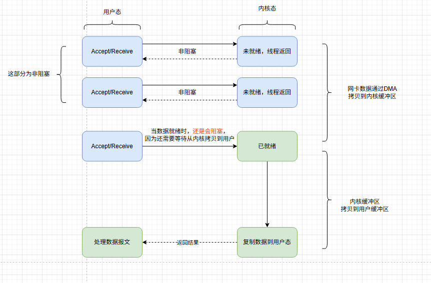 当数据未就绪时(内核缓冲区无数据),非阻塞模式下的Accept/Receive会立即返回WouldBlock异常(或-1);当数据就绪时,调用会立即返回读取的字节数(>0),不会阻塞线程。数据从内核缓冲区到用户缓冲区的拷贝由 CPU 同步完成,属于正常 IO 操作流程,不涉及线程阻塞