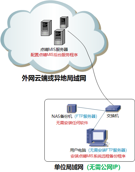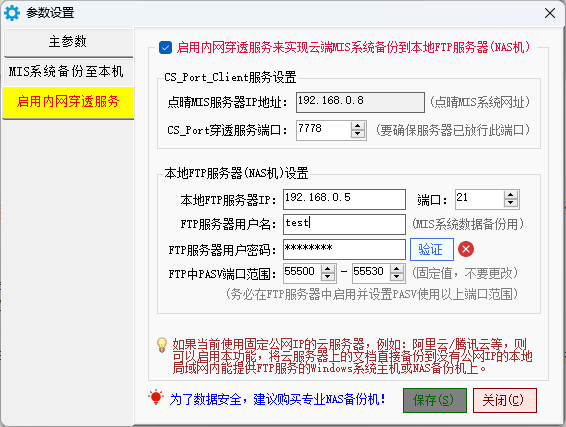 方法2为本程序和点晴MIS服务器之间创建CS_Port内网穿透服务,然后在云端的点晴MIS服务器上安装备份软件,通过FTP协议将服务器上的文件同步备份到局域网内能提供FTP服务的群晖NAS备份机上。