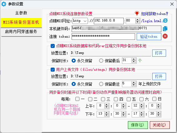 • 点晴MS服务器IP地址:就是第二个卡片MIS系统备份至本机”中点晴MIS系统网址,禁止更改。